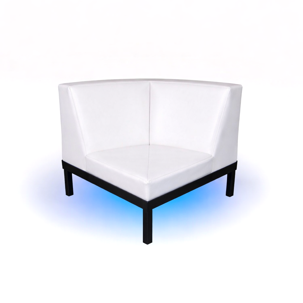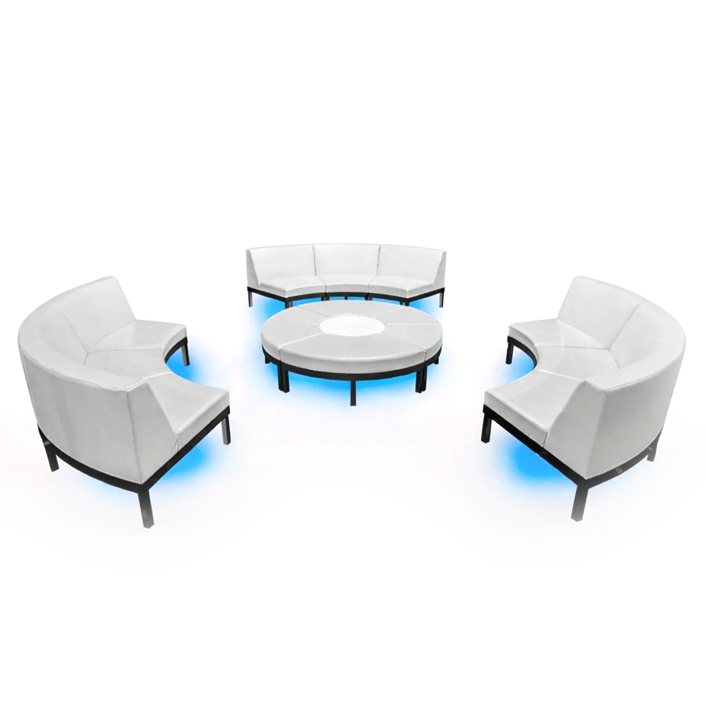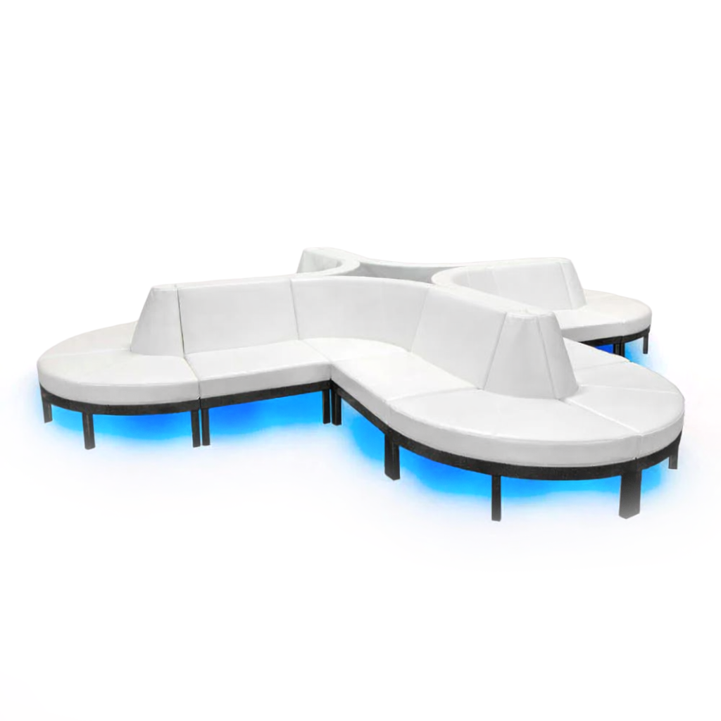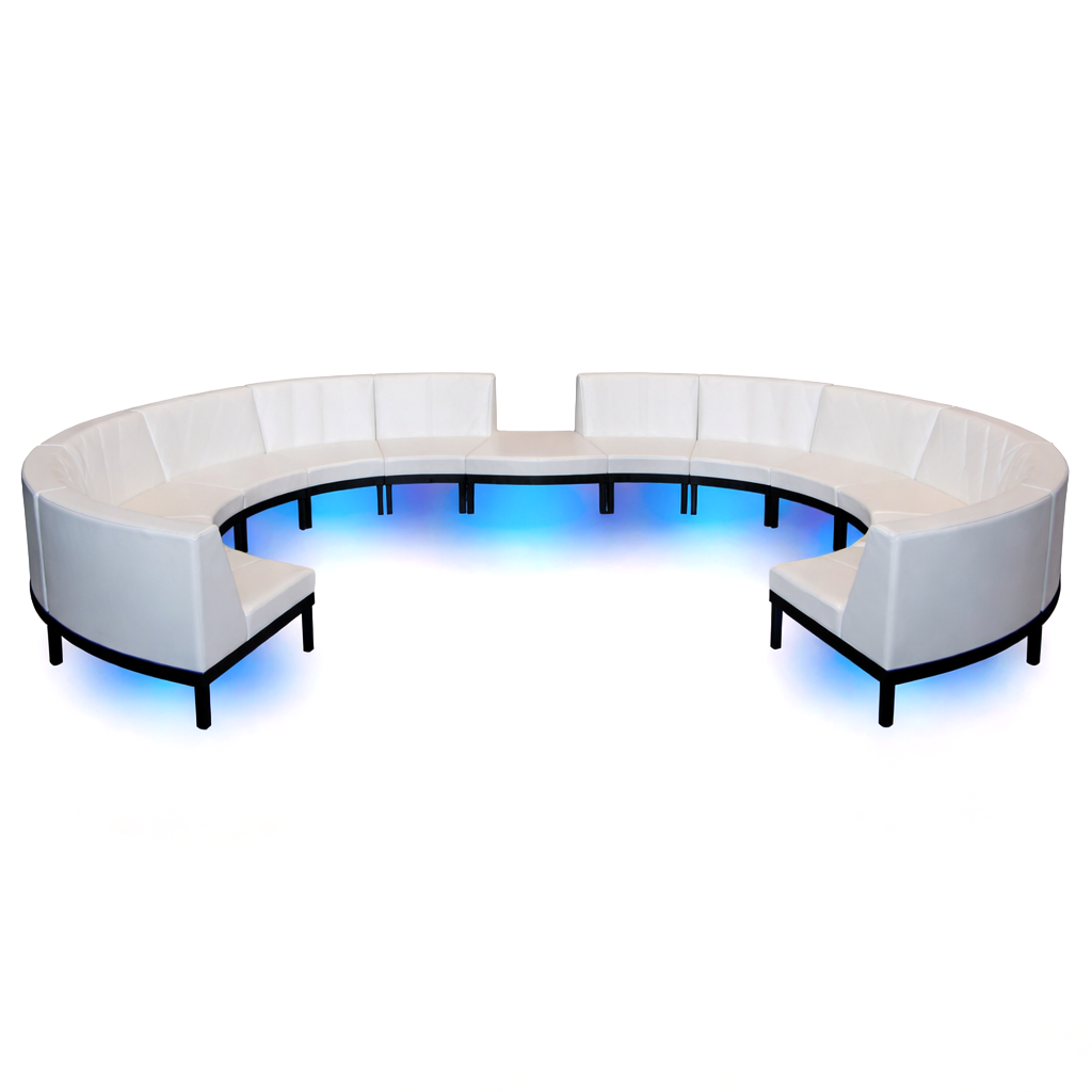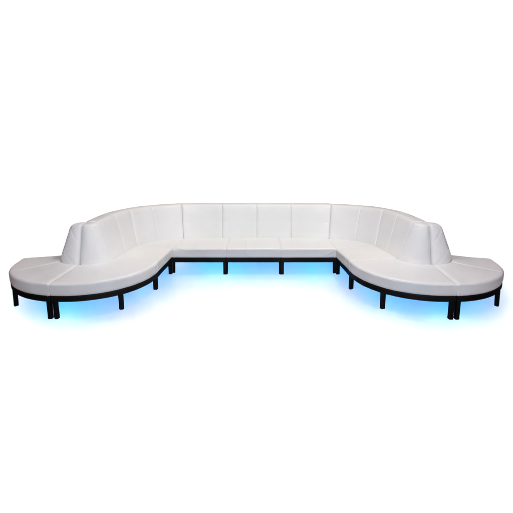 Exposed silver vein feet and frames add structure and solidity to counterpoint the breezy contemporary designs. Add swing tables with optional charging stations or underlighting in a variety of colors to further enhance the stylish vibe. Combine the elements in a distinct combination to customize the perfect pieces for your event.