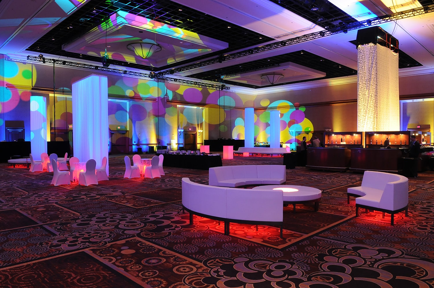GeoPanels are designed to install quickly and easily. These lightweight tiles connect with our included hardware and can be hung from either the drape line or truss. Uplighting and customized logos are a great way to enhance these panels.